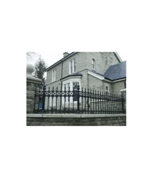 Elegant European-style wrought iron fence with ornate detailing, handcrafted for timeless curb appeal by Monarch Custom Doors.
