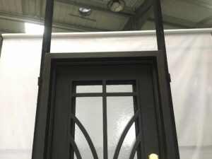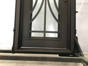 The Wrought Iron Door EL1181 MCD highlights an art nouveau style wrought iron door circular geometric motif framed within a clean single-door silhouette. Its frosted glass panels provide privacy while allowing soft light to enter. Hand-forged from 12 gauge wrought iron, it features a powder-coated matte finish for durability and style. Ideal for modern homes and offices, this design blends artistry and minimalism to create an entryway of contemporary distinction.